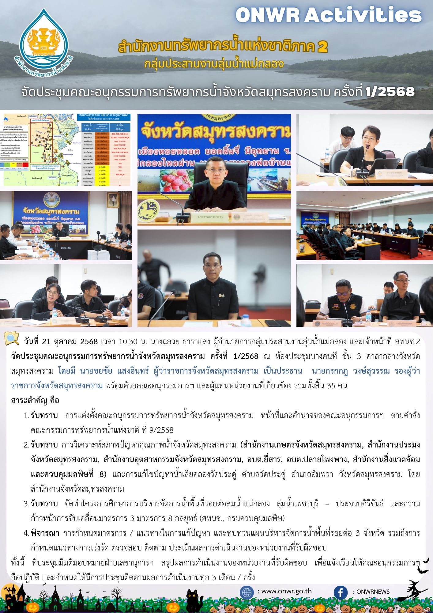 สทนช.2 จัดประชุมคณะอนุกรรมการทรัพยากรน้ำจังหวัดสมุทรสงคราม ครั้งที่ 1/2568 30 ตุลาคม 2025 by ปวีณา ประกอบพันธ์
