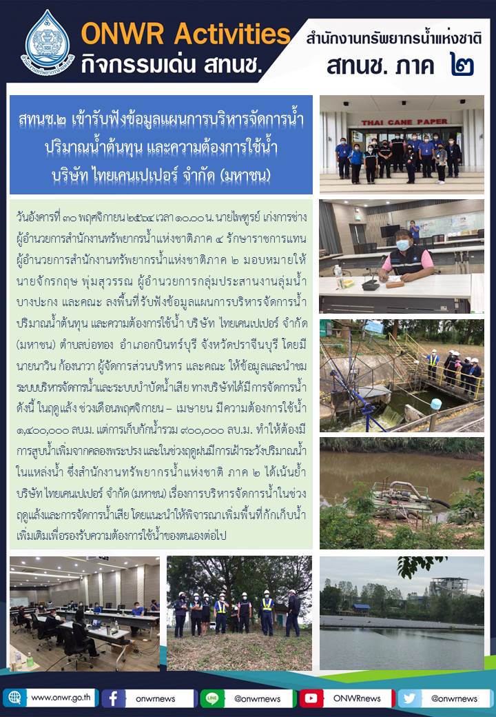 สทนช.2 เข้ารับฟังข้อมูลแผนการบริหารจัดการน้ำ ปริมาณน้ำต้นทุน และความต้องการใช้น้ำ บริษัท ไทยเคนเปเปอร์ จำกัด (มหาชน)