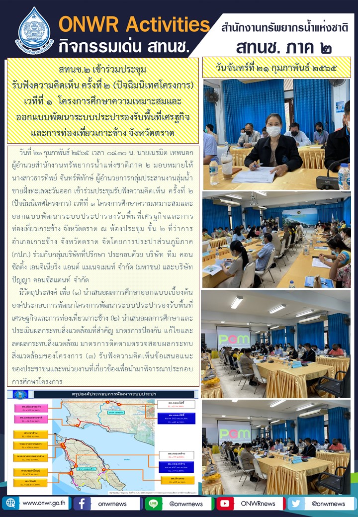 สทนช.2 เข้าร่วมประชุมรับฟังความคิดเห็น ครั้งที่ 2 (ปัจฉิมนิเทศโครงการ) เวทีที่ 1 โครงการศึกษาความเหมาะสมและออกแบบพัฒนาระบบประปารองรับพื้นที่เศรฐกิจและการท่องเที่ยวเกาะช้าง จังหวัดตราด 21 กุมภาพันธ์ 2022 by ชลธิชา เมฆนิล