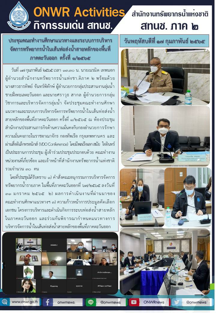 การประชุมคณะทำงานศึกษาแนวทางและระบบการบริหารจัดการทรัพยากรน้ำในเส้นท่อส่งน้ำสายหลักของพื้นที่ภาคตะวันออก ครั้งที่ 1/2565 18 กุมภาพันธ์ 2022 by ชลธิชา เมฆนิล