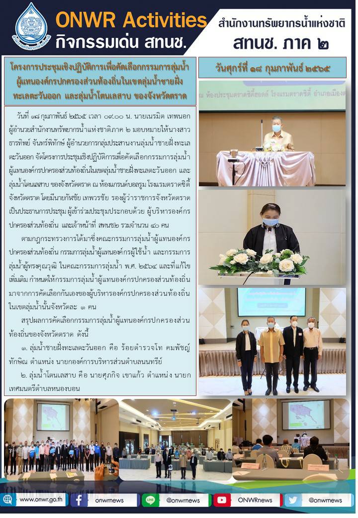 การประชุมเชิงปฏิบัติการคัดเลือกเป็นกรรมการลุ่มน้ำผู้แทนองค์กรปกครองส่วนท้องถิ่น ในเขตลุ่มน้ำชายฝั่งทะเลตะวันออก และลุ่มน้ำโตนเลสาบ ของจังหวัดตราด 18 กุมภาพันธ์ 2022 by ชลธิชา เมฆนิล