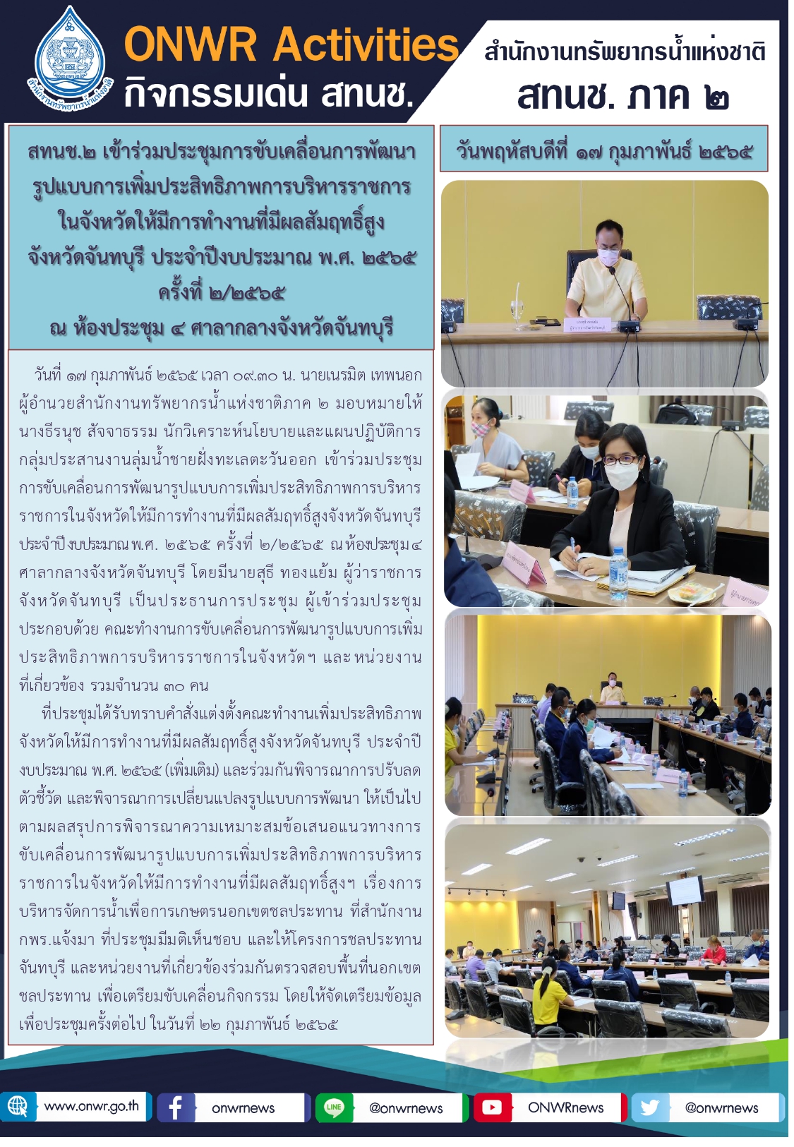 ประชุมการขับเคลื่อนการพัฒนารูปแบบการ เพิ่มประสิทธิภาพการบริหารราชการในจังหวัดให้มีการทำงานที่มีผลสัมฤทธิ์สูงจังหวัดจันทบุรี ประจำปีงบประมาณ พ.ศ. 2565 ครั้งที่ 2/2565 18 กุมภาพันธ์ 2022 by ชลธิชา เมฆนิล