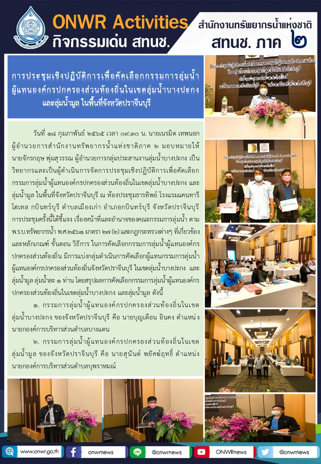 การประชุมเชิงปฏิบัติการเพื่อคัดเลือกกรรมการลุ่มน้ำผู้แทนองค์กรปกครองส่วนท้องถิ่นในเขตลุ่มน้ำบางปะกง และลุ่มน้ำมูล ในพื้นที่จังหวัดปราจีนบุรี 19 กุมภาพันธ์ 2022 by ชลธิชา เมฆนิล