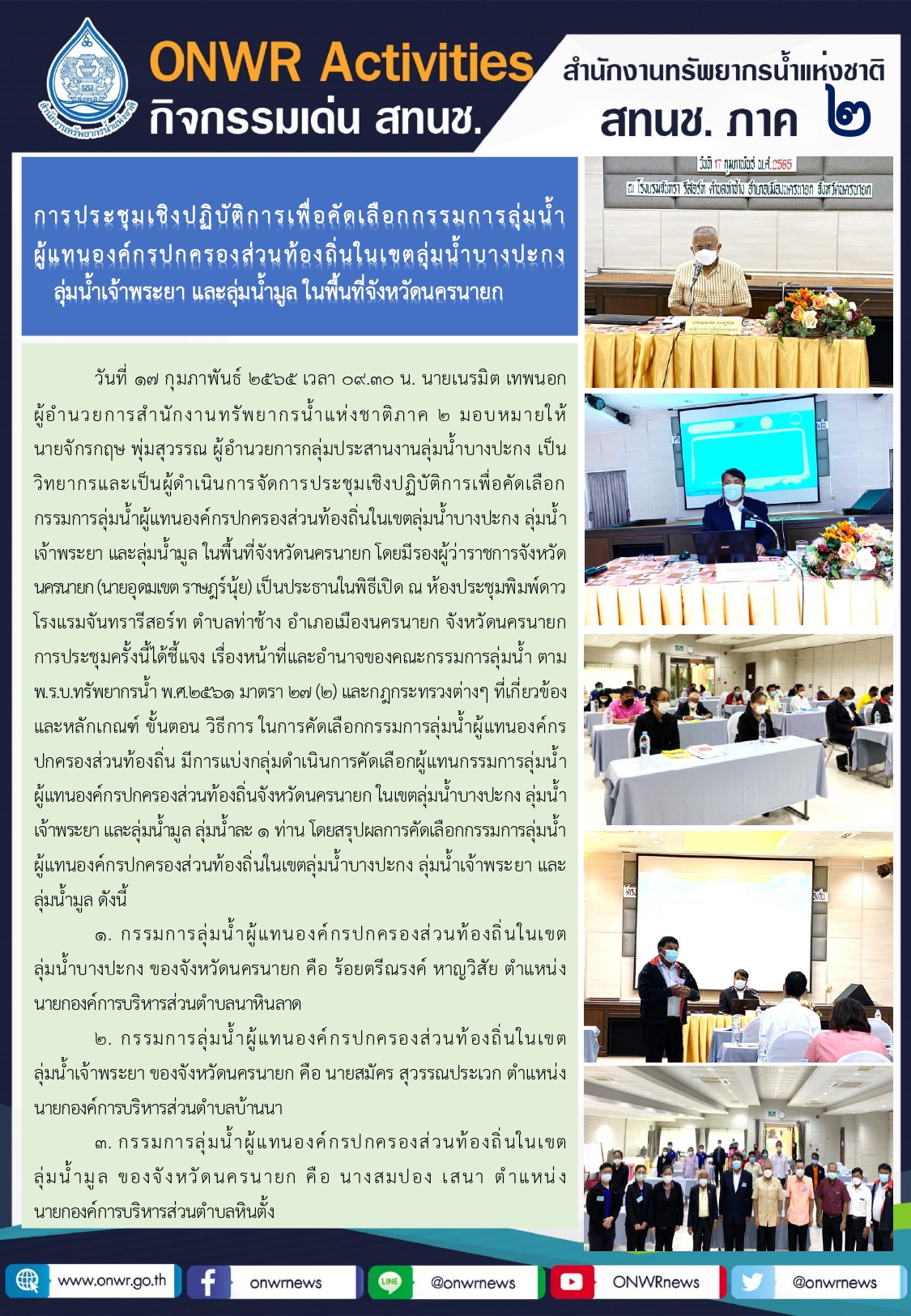การประชุมเชิงปฏิบัติการเพื่อคัดเลือกกรรมการลุ่มน้ำผู้แทนองค์กรปกครองส่วนท้องถิ่นในเขตลุ่มน้ำบางปะกง ลุ่มน้ำเจ้าพระยา และลุ่มน้ำมูล ในพื้นที่จังหวัดนครนายก 18 กุมภาพันธ์ 2022 by ชลธิชา เมฆนิล