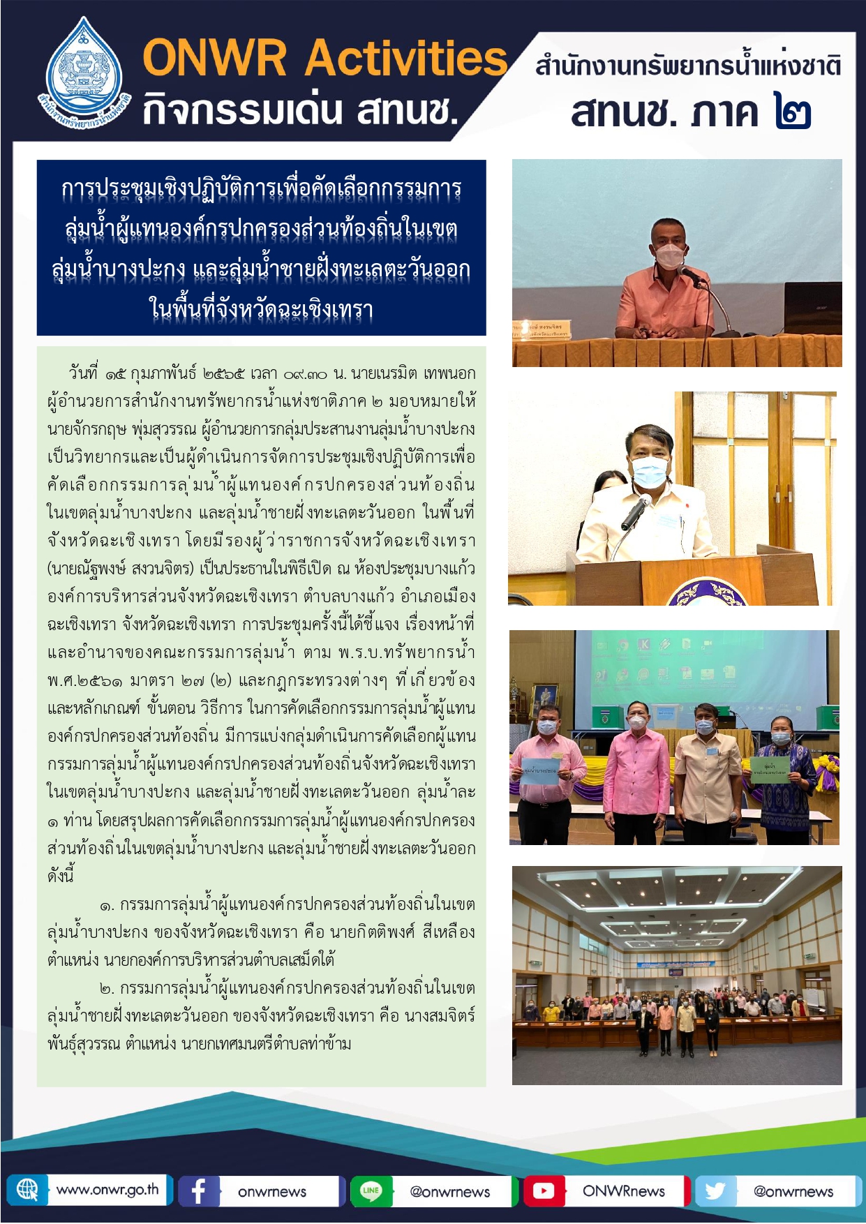 การประชุมเชิงปฏิบัติการเพื่อคัดเลือกเป็นกรรมการลุ่มน้ำผู้แทนองค์กรปกครองส่วนท้องถิ่น ในเขตลุ่มน้ำบางปะกง และลุ่มน้ำชายฝั่งทะเลตะวันออก ในพื้นที่จังหวัดฉะเชิงเทรา 15 กุมภาพันธ์ 2022 by ชลธิชา เมฆนิล