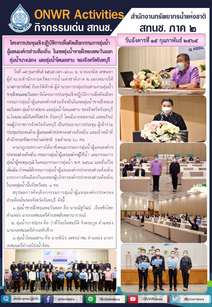 โครงการประชุมเชิงปฏิบัติการคัดเลือกเป็นกรรมการลุ่มน้ำผู้แทนองค์กรส่วนท้องถิ่น ในเขตลุ่มน้ำชายฝั่งทะเลตะวันออก ลุ่มน้ำบางปะกง และลุ่มน้ำโตนเลสาบ ของจังหวัดจันทบุรี 15 กุมภาพันธ์ 2022 by ชลธิชา เมฆนิล