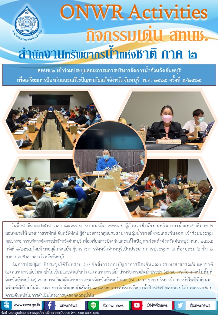สทนช.2 เข้าร่วมประชุมคณะกรรมการบริหารจัดการน้ำจังหวัดจันทบุรี เพื่อเตรียมการป้องกันและแก้ไขปัญหาภัยแล้งจังหวัดจันทบุรี พ.ศ. 2565 ครั้งที่ 1/2565 30 มีนาคม 2022 by ชลธิชา เมฆนิล
