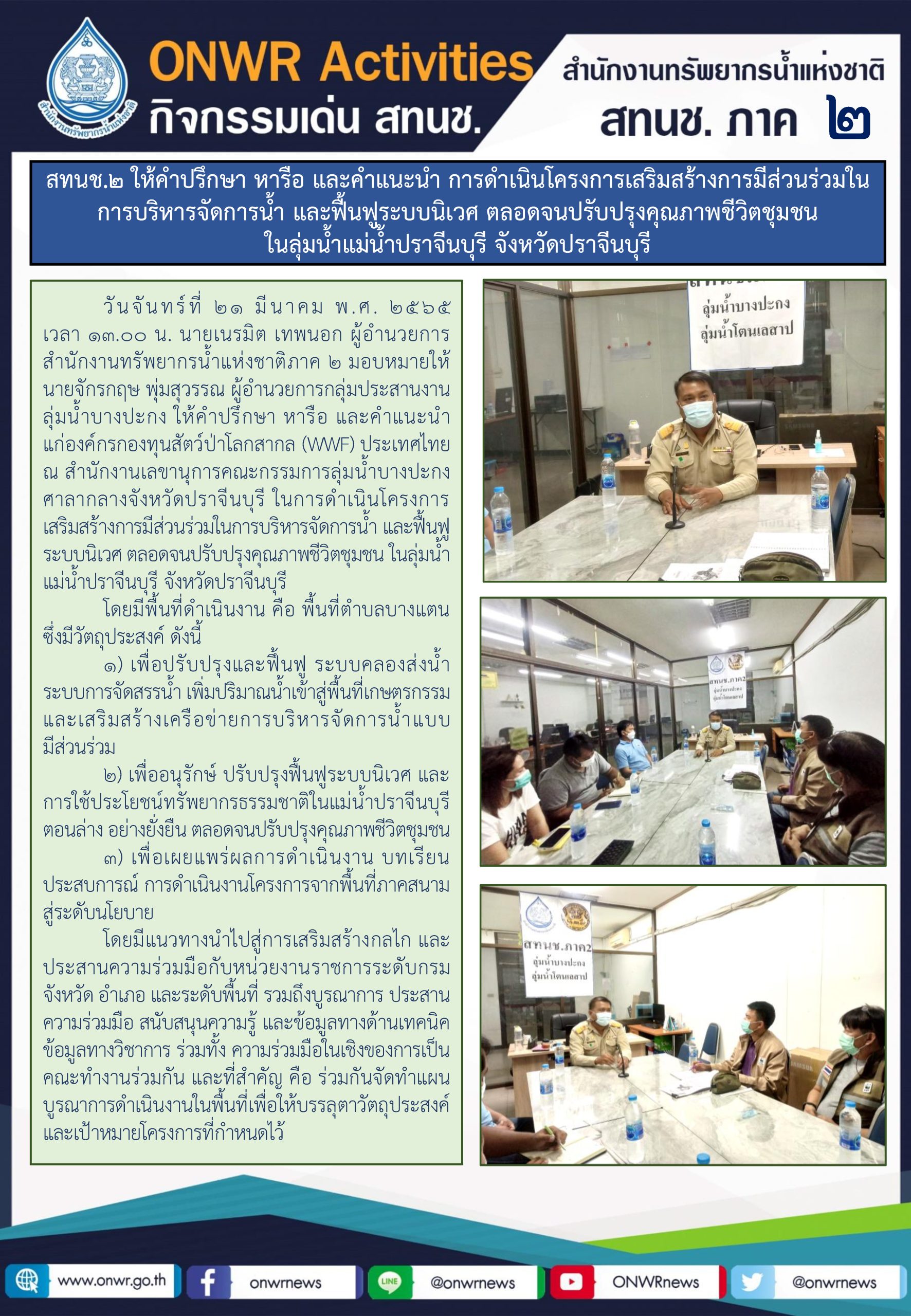 สทนช.2 ให้คำปรึกษา หารือ และคำแนะนำ แก่องค์กรกองทุนสัตว์ป่าโลก(WWF) ประเทศไทย ในการดำเนินโครงการเสริมสร้างการมีส่วนร่วมในการบริหารจัดการน้ำ และฟื้นฟูระบบนิเวศ ตลอดจนปรับปรุงคุณภาพชีวิตชุมชน ในลุ่มน้ำแม่น้ำปราจีนบุรี จังหวัดปราจีนบุรี 21 มีนาคม 2022 by ชลธิชา เมฆนิล