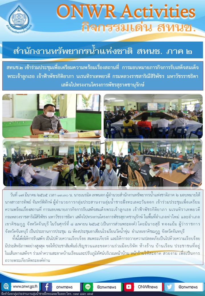 การประชุมเพื่อเตรียมความพร้อมเรื่องสถานที่ การมอบหมายภารกิจการรับเสด็จสมเด็จพระเจ้าลูกเธอ เจ้าฟ้าพัชรกิติยาภา นเรนทิราเทพยวดี กรมหลวงราชสาริณีสิริพัชร มหาวัชรราชธิดา เสด็จไปทรงงานโครงการพัชรสุธาคชานุรักษ์ 21 มีนาคม 2022 by ชลธิชา เมฆนิล