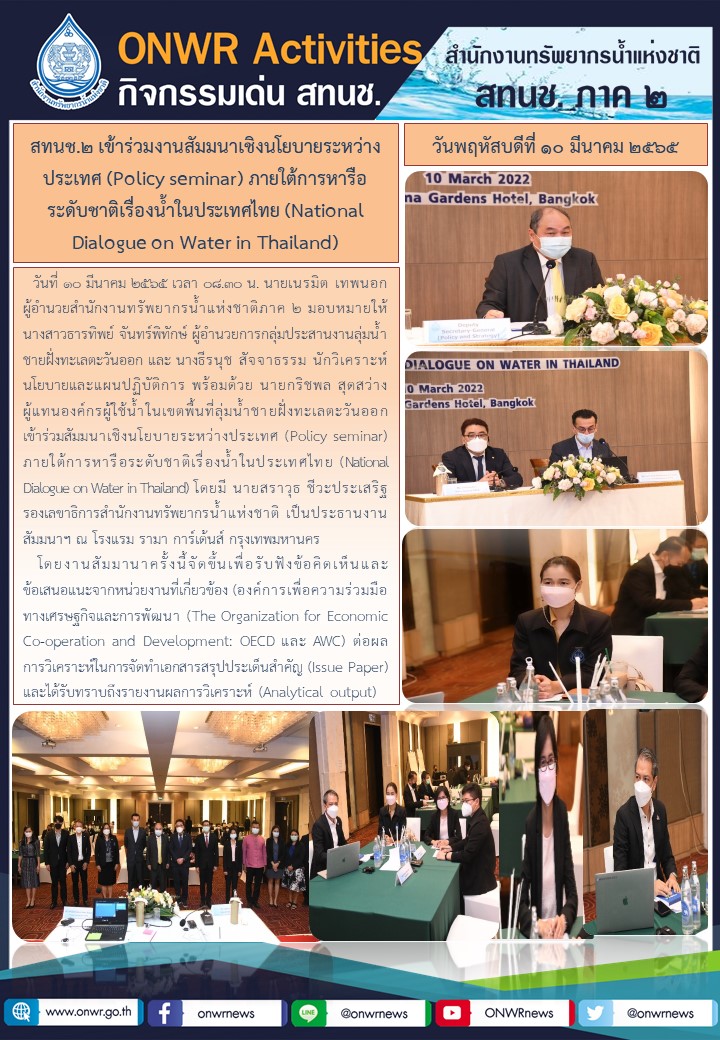 สทนช.2 เข้าร่วมงานสัมมนาเชิงนโยบายระหว่างประเทศ (Policy seminar) ภายใต้การหารือระดับชาติเรื่องน้ำในประเทศไทย (National Dialogue on Water in Thailand) 11 มีนาคม 2022 by ชลธิชา เมฆนิล