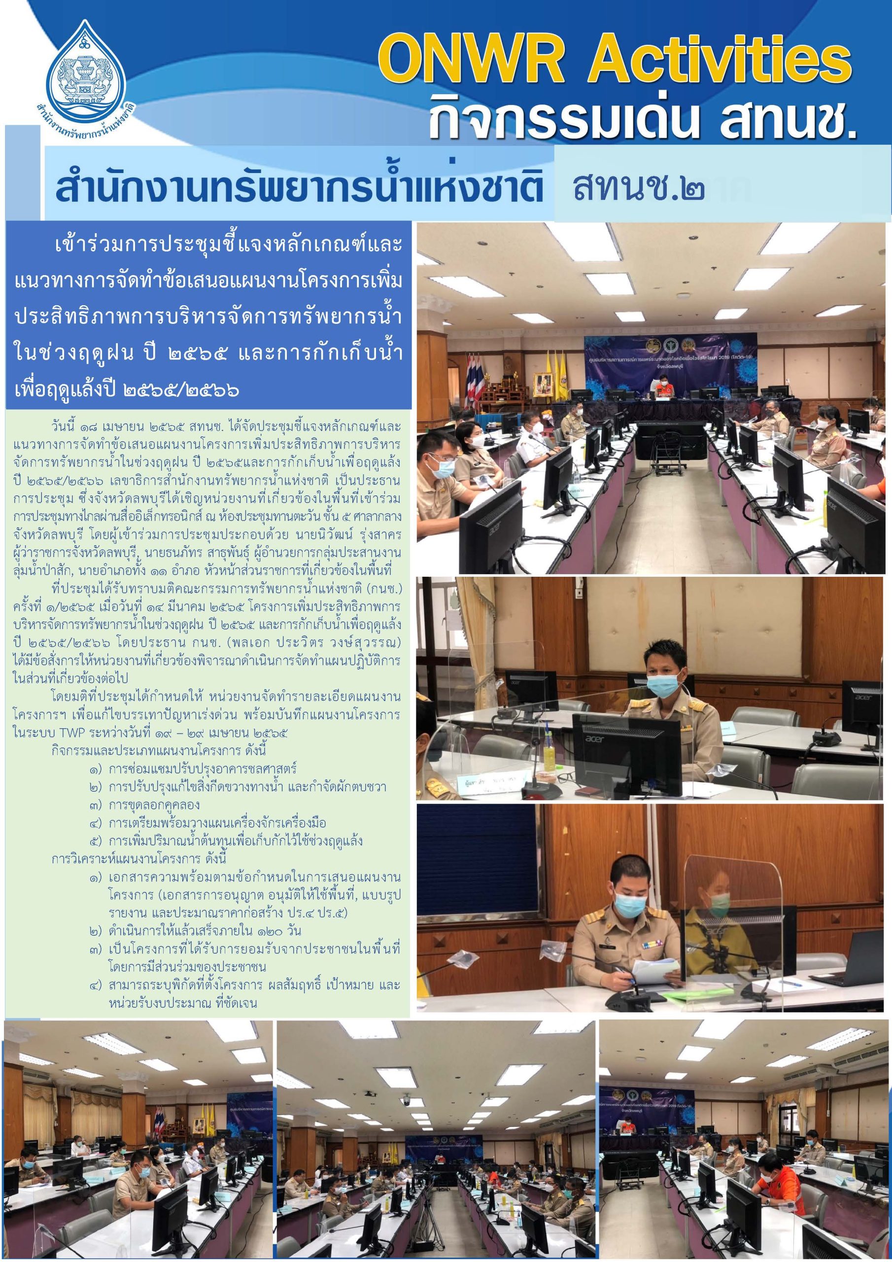 การเข้าร่วมประชุมชี้แจงหลักเกณฑ์และแนวทางการจัดทำข้อเสนอแผนงานโครงการเพิ่มประสิทธิภาพการบริหารจัดการทรัพยากรน้ำในช่วงฤดูฝน ปี 2565 และการกักเก็บน้ำเพื่อฤดูแล้ง ปี 2565/2566 จังหวัดลพบุรี 19 เมษายน 2022 by ชลธิชา เมฆนิล