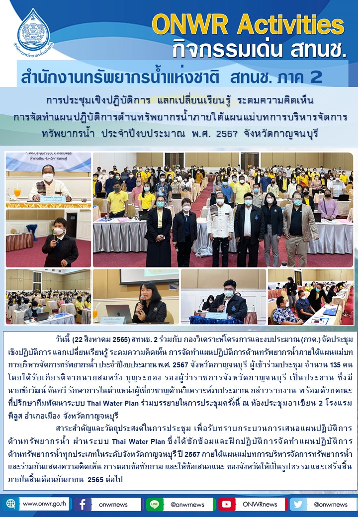 การประชุมเชิงปฏิบัติการ แลกเปลี่ยนเรียนรู้ ระดมความคิดเห็น การจัดทำแผนปฏิบัติการด้านทรัพยากรน้ำภายใต้แผนแม่บทการบริหารจัดการทรัพยากรน้ำ ประจำปีงบประมาณ พ.ศ.2567 จังหวัดกาญจนบุรี 22 สิงหาคม 2022 by ชลธิชา