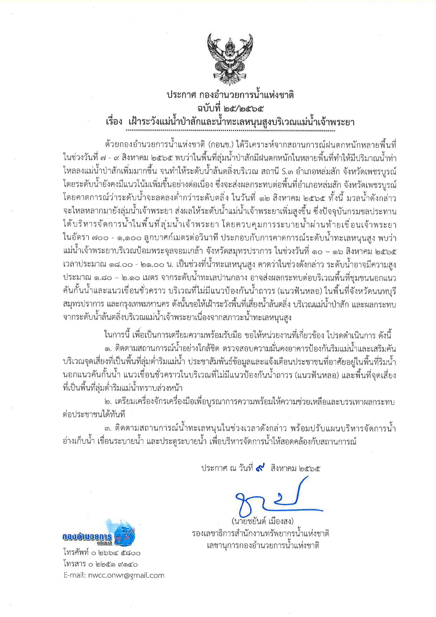 ประกาศ กองอำนวยการน้ำแห่งชาติ ฉบับที่ 25/2565เรื่อง เฝ้าระวังแม่น้ำป่าสักและน้ำทะเลหนุนสูงบริเวณแม่น้ำเจ้าพระยา 10 สิงหาคม 2022 by ชลธิชา เมฆนิล