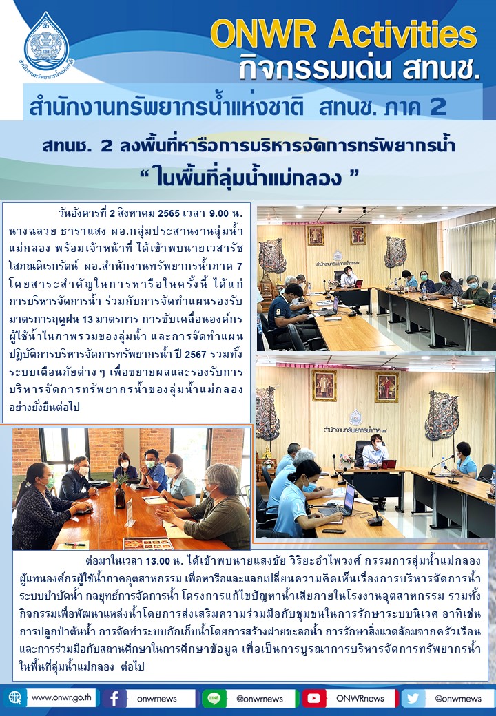 สทนช.2 ลงพื้นที่หารือการบริหารจัดการทรัพยากรน้ำ “ในพื้นที่ลุ่มน้ำแม่กลอง” 4 สิงหาคม 2022 by ชลธิชา เมฆนิล