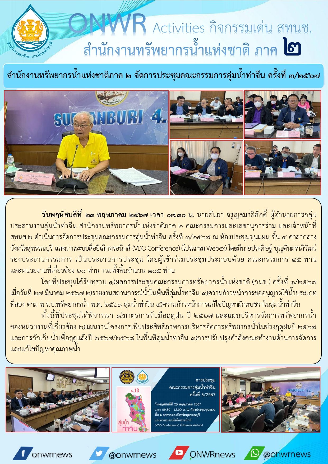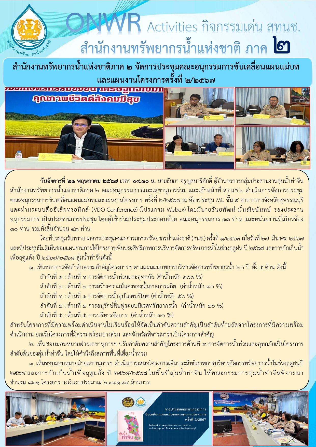 สทนช.2 จัดประชุมคณะอนุกรรมการขับเคลื่อนแผนแม่บทและแผนงานโครงการครั้งที่ 2/2567 30 พฤษภาคม 2024 by ปวีณา ประกอบพันธ์