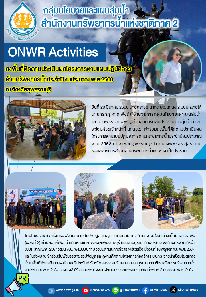 สทนช.2 ลงพื้นที่ติดตามประเมินผลโครงการตามแผนปฏิบัติการ ด้านทรัพยากรน้ำประจำปี งบประมาณ พ.ศ.2568 ณ จังหวัดสุพรรณบุรี 31 มีนาคม 202531 มีนาคม 2025 by ปวีณา ประกอบพันธ์