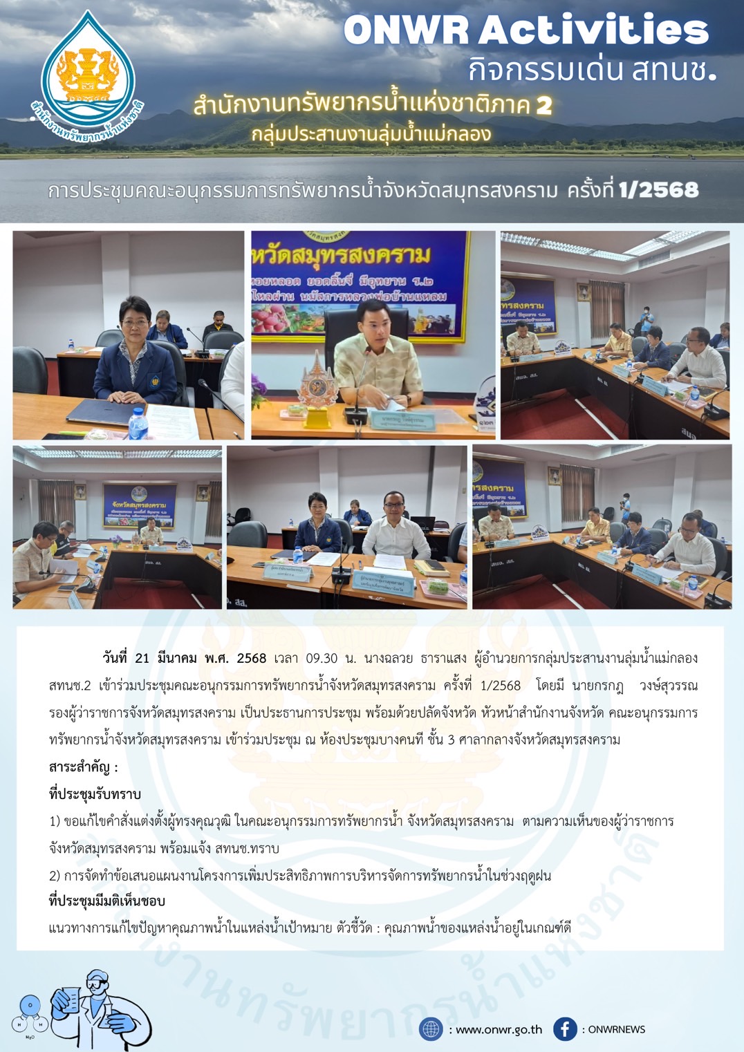 สทนช.2 เข้าร่วมประชุมคณะอนุกรรมการทรัพยากรน้ำจังหวัดสมุทรสงคราม ครั้งที่1/2568 24 มีนาคม 2025 by ปวีณา ประกอบพันธ์