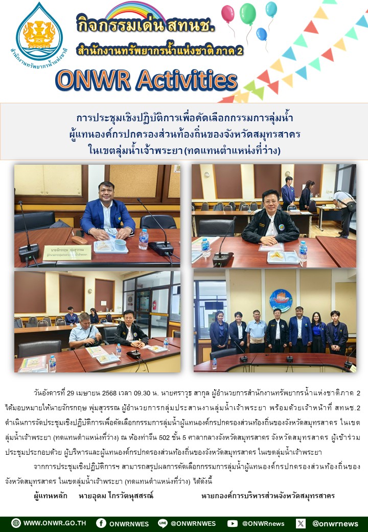 สทนช.2จัดประชุมเชิงปฏิบัติการเพื่อคัดเลือกกรรมการลุ่มน้ำผู้แทนองค์กรปกครองส่วนท้องถิ่นของ จ.สมุทรสาคร ในเขตลุ่มน้ำเจ้าพระยา (ทดแทนตำแหน่งที่ว่าง) 30 เมษายน 2025 by ปวีณา ประกอบพันธ์