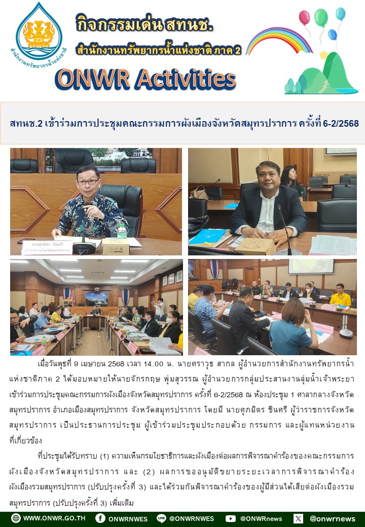 สทนช.2เข้าร่วมการประชุมคณะกรรมการผังเมือง จ.สมุทรปราการ ครั้งที่ 6-2/2568 23 เมษายน 2025 by ปวีณา ประกอบพันธ์