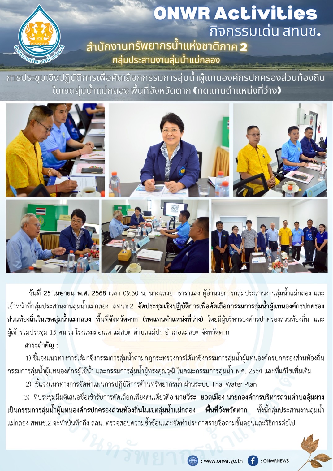 สทนช.2 ประชุมเชิงปฏิบัติการเพื่อคัดเลือกกรรมการลุ่มน้ำผู้แทนองค์กรปกครองส่วนท้องถิ่น ในเขตลุ่มน้ำแม่กลอง พื้นที่จังหวัดตาก (ทดแทนตำแหน่งที่ว่าง) 29 เมษายน 2025 by ปวีณา ประกอบพันธ์