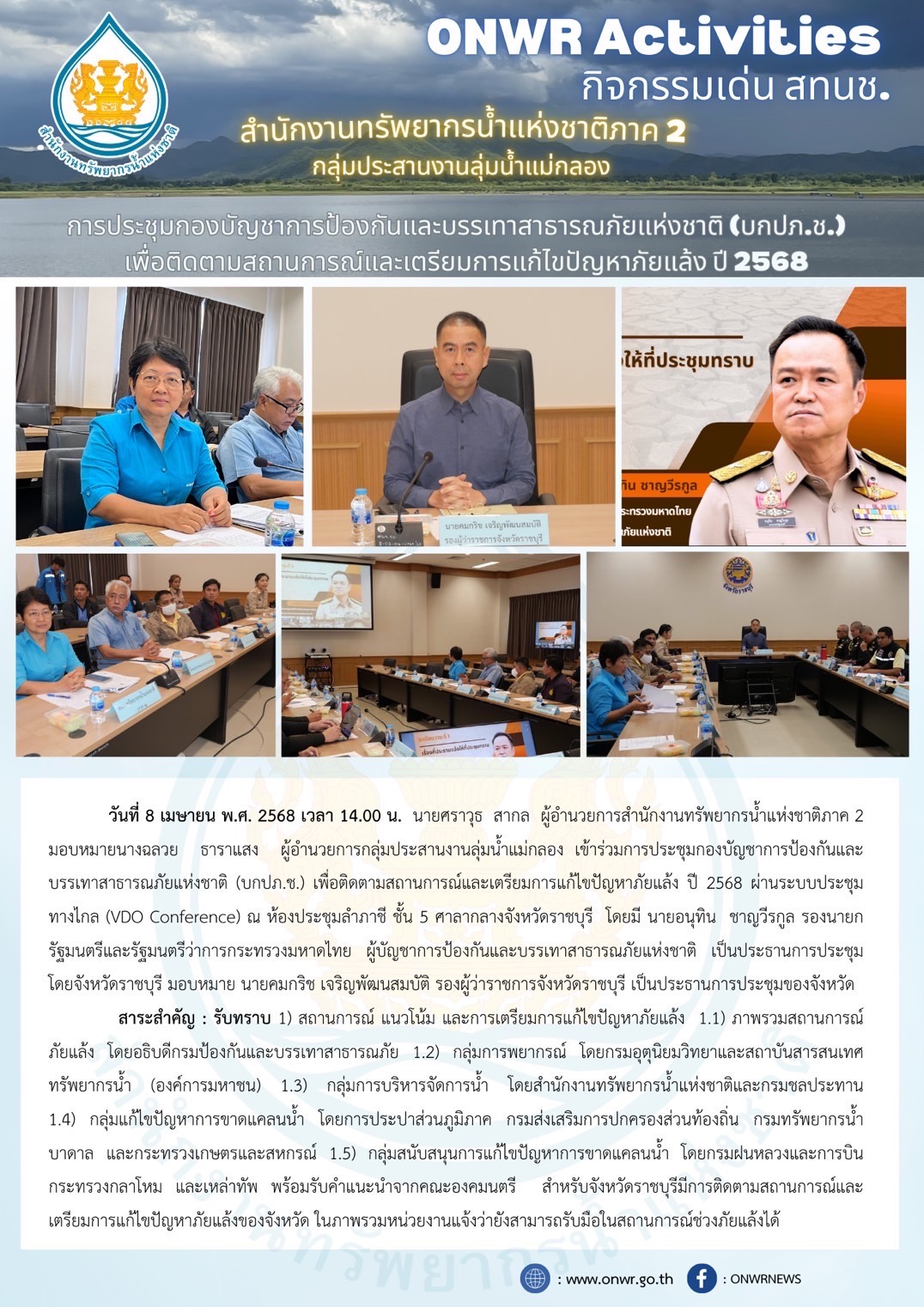 สทนช.เข้าร่วมประชุมกองบัญชาการป้องกันและบรรเทาสาธารณภัยแห่งชาติ แก้ไขภัยแล้ง ลุ่มน้ำแม่กลอง 10 เมษายน 2025 by ปวีณา ประกอบพันธ์
