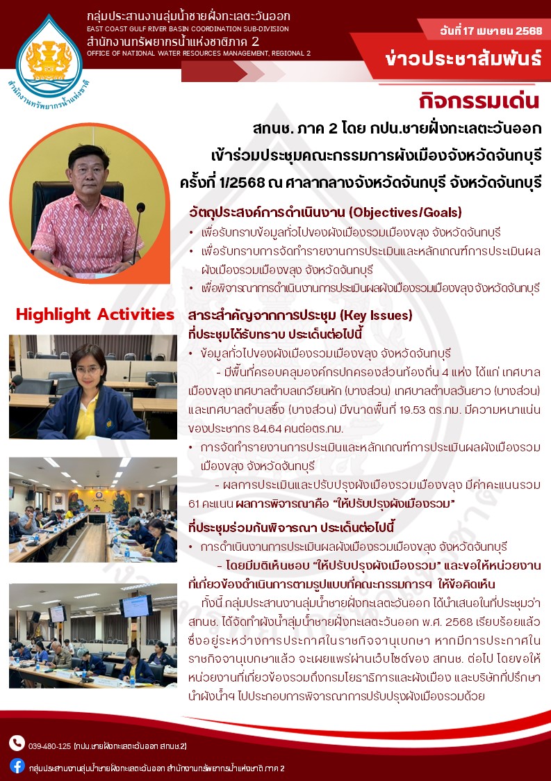 สทนช.2 เข้าร่วมประชุมคณะกรรมการผังเมืองจังหวัดจันทบุรี ครั้งที่1/2568 23 เมษายน 2025 by ปวีณา ประกอบพันธ์
