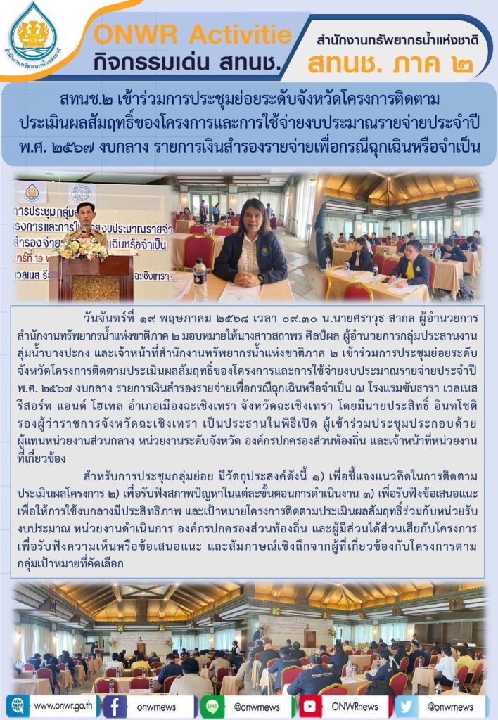 สทนช.2 เข้าร่วมการประชุมย่อยระดับจังหวัดโครงการติดตามประเมินผลสัมฤทธิ์ของโครงการและการใช้จ่ายงบประมาณรายจ่ายประจำปี พ.ศ. 2567 งบกลาง รายการเงินสำรองรายจ่ายเพื่อกรณีฉุกเฉินหรือจำเป็น 20 พฤษภาคม 2025 by ปวีณา ประกอบพันธ์