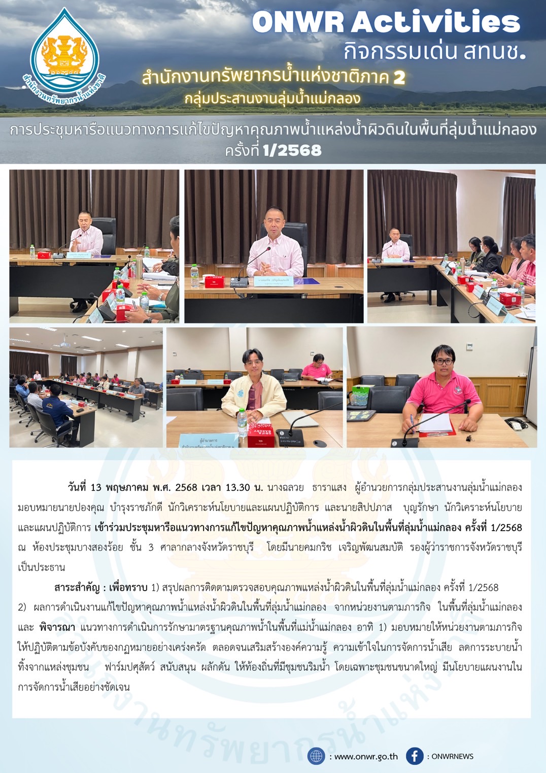 สทนช.2 เข้าร่วมประชุมหารือแนวทางการแก้ไขปัญหาคุณภาพน้ำแหล่งน้ำผิวดินในพื้นที่ลุ่มน้ำแม่กลอง 14 พฤษภาคม 2025 by ปวีณา ประกอบพันธ์