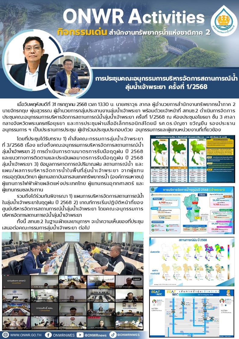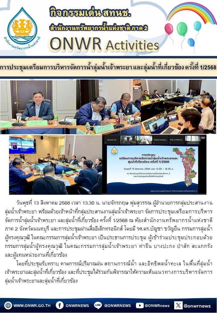 สทนช.2 จัดประชุมเตรียมการบริหารจัดการน้ำลุ่มน้ำเจ้าพระยาและลุ่มน้ำที่เกี่ยวข้อง ครั้งที่ 1/2568 19 สิงหาคม 2025 by ปวีณา ประกอบพันธ์