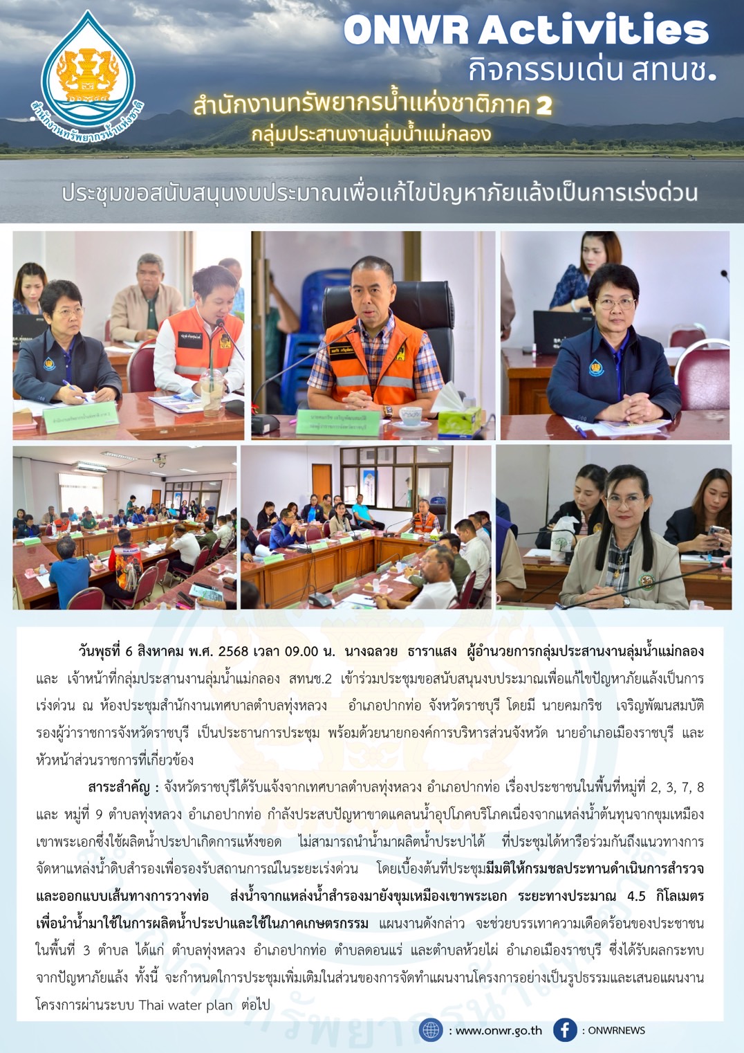 สทนช.2 เข้าร่วมประชุมขอสนับสนุนงบประมาณเพื่อแก้ไขปัญหาภัยแล้งเป็นการเร่งด่วน 15 สิงหาคม 2025 by ปวีณา ประกอบพันธ์