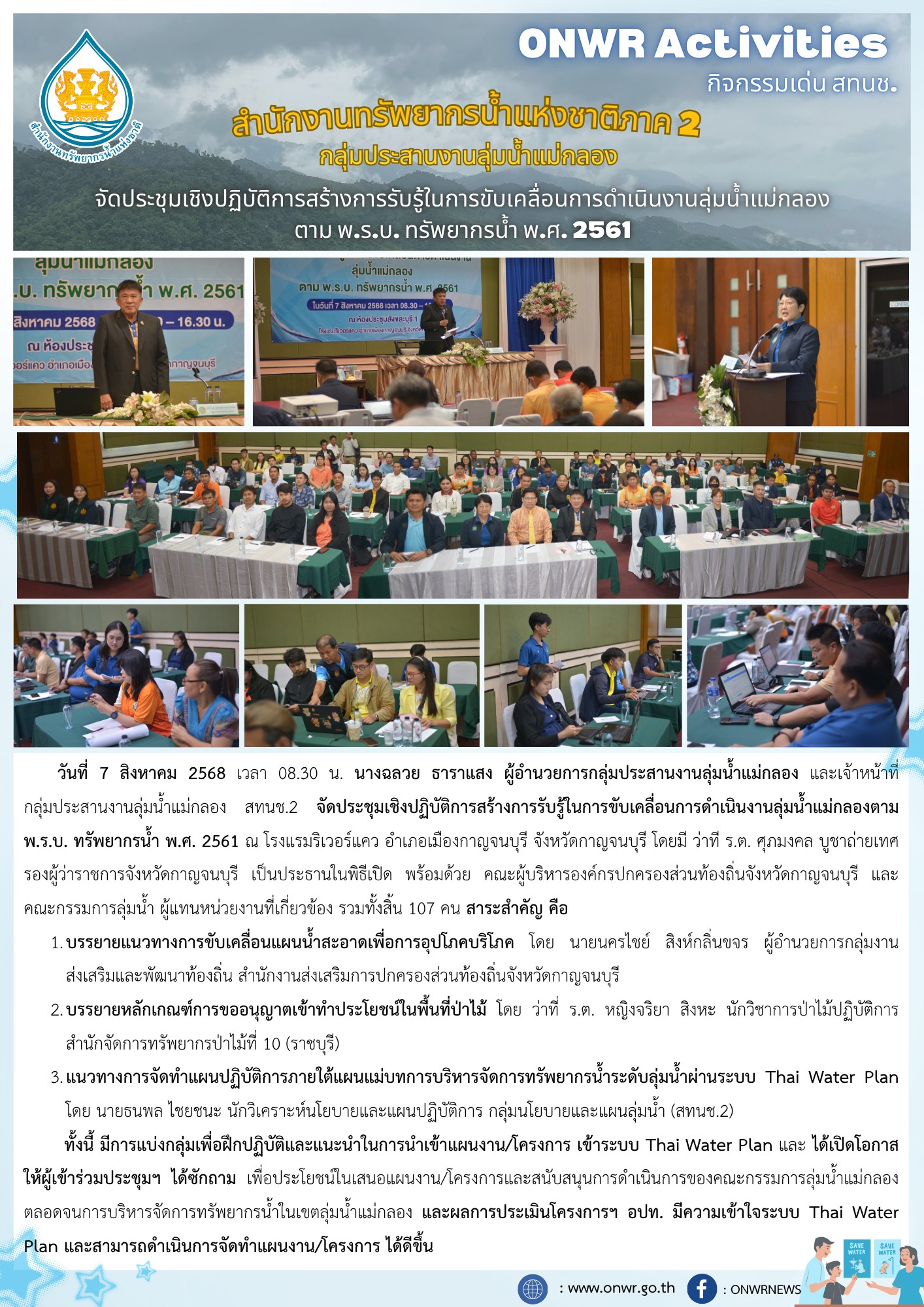 สทนช.2 จัดประชุมเชิงปฏิบัติการสร้างการรับรู้ในการขับเคลื่อนการดำเนินงานลุ่มน้ำแม่กลอง ตาม พ.ร.บ.ทรัพยากรน้ำ พ.ศ.2561 15 สิงหาคม 2025 by ปวีณา ประกอบพันธ์