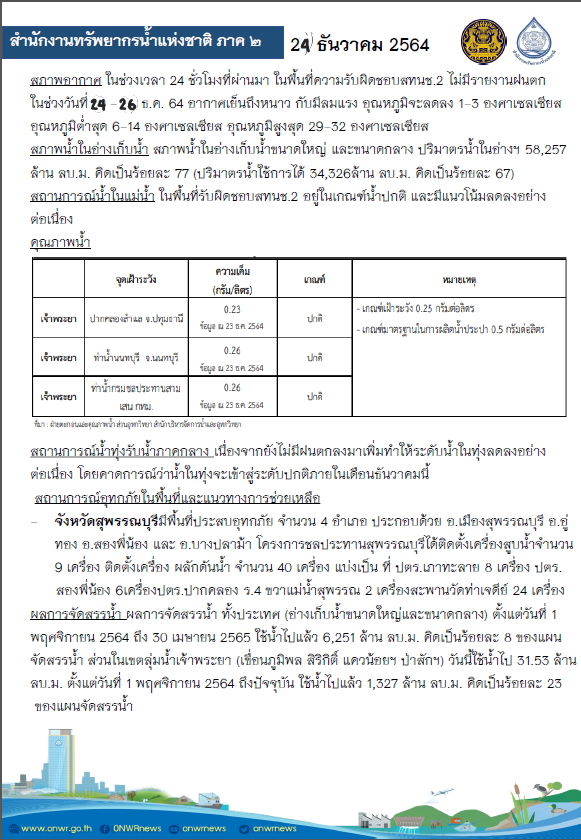 รายงานสถานการณ์น้ำ วันที่ 24 ธันวาคม 2564