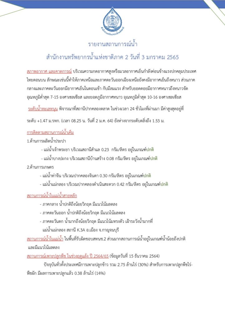 รายงานสถานการณ์น้ำ วันที่ 3 มกราคม 2565