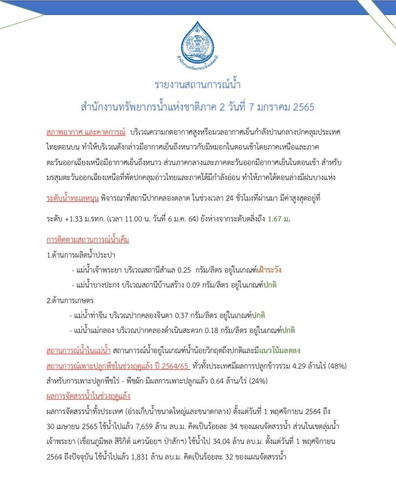 รายงานสถานการณ์น้ำ วันที่ 7 มกราคม 2565