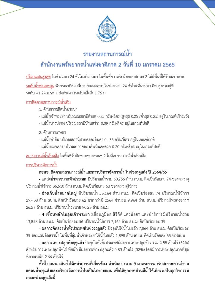 รายงานสถานการณ์น้ำ วันที่ 10 มกราคม 2565