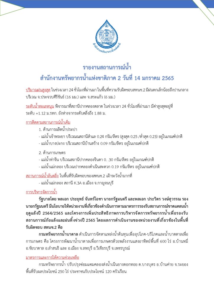 รายงานสถานการณ์น้ำ วันที่ 14 มกราคม 2565