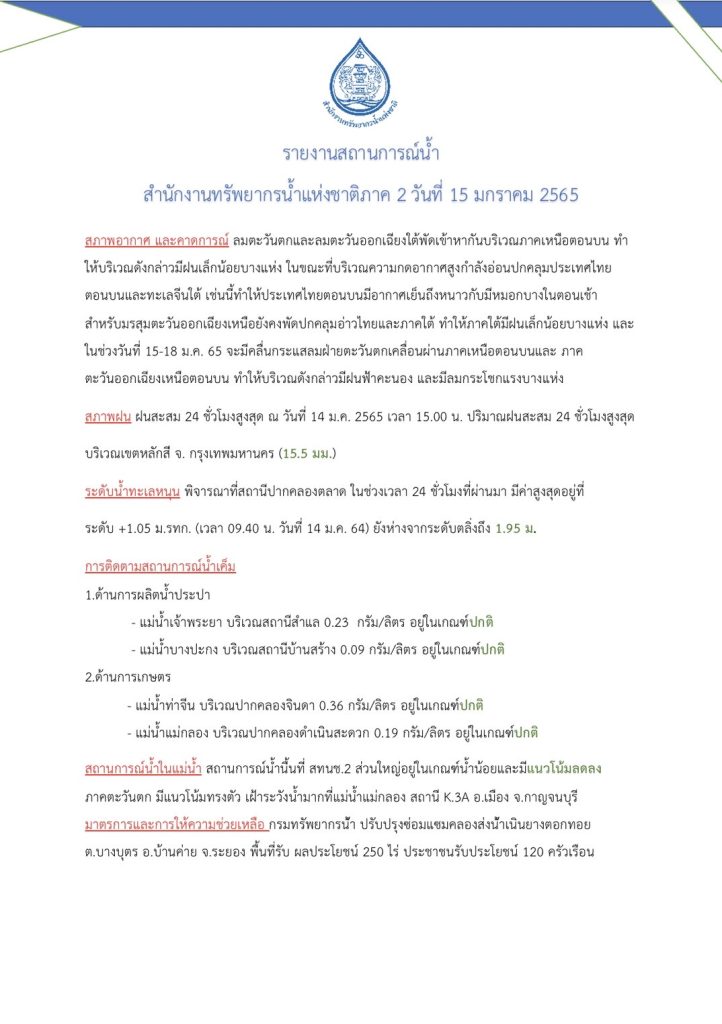 รายงานสถานการณ์น้ำ วันที่ 15 มกราคม 2565