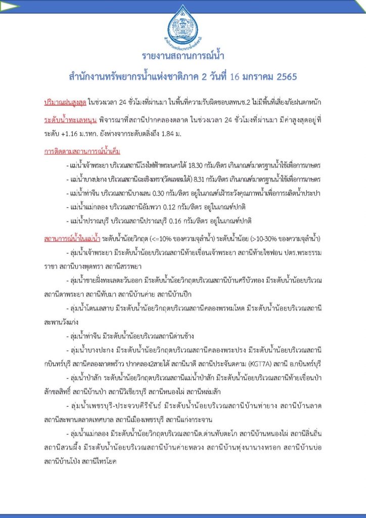 รายงานสถานการณ์น้ำ วันที่ 16 มกราคม 2565