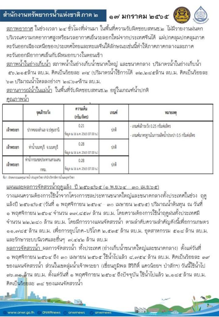 รายงานสถานการณ์น้ำ วันที่ 17 มกราคม 2565