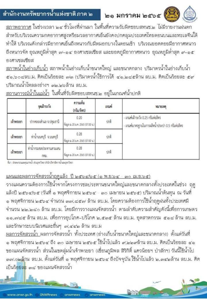 รายงานสถานการณ์น้ำ วันที่ 21 มกราคม 2565