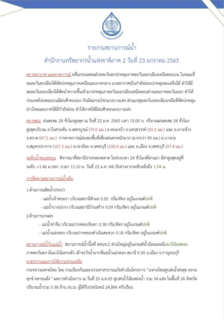 รายงานสถานการณ์น้ำ วันที่ 23 มกราคม 2565