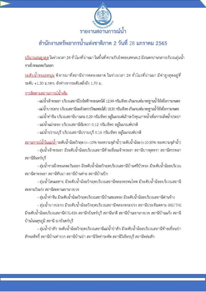 รายงานสถานการณ์น้ำ วันที่ 28 มกราคม 2565