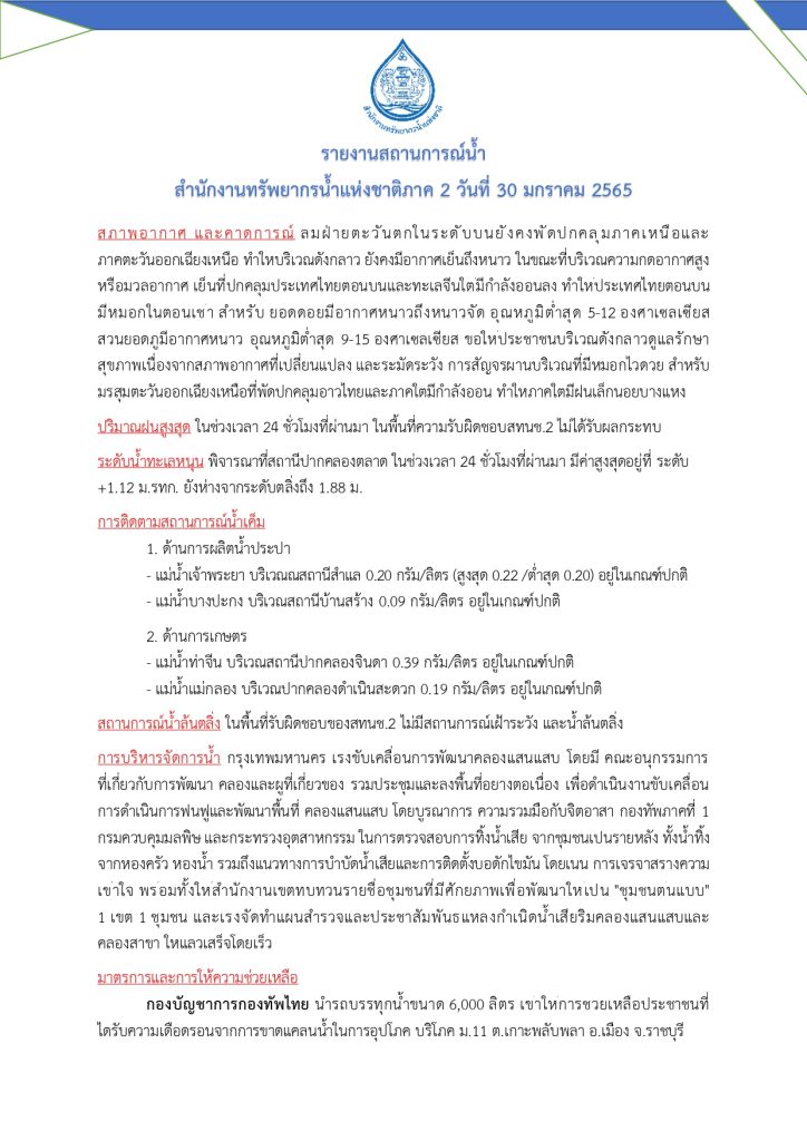 รายงานสถานการณ์น้ำ วันที่ 30 มกราคม 2565
