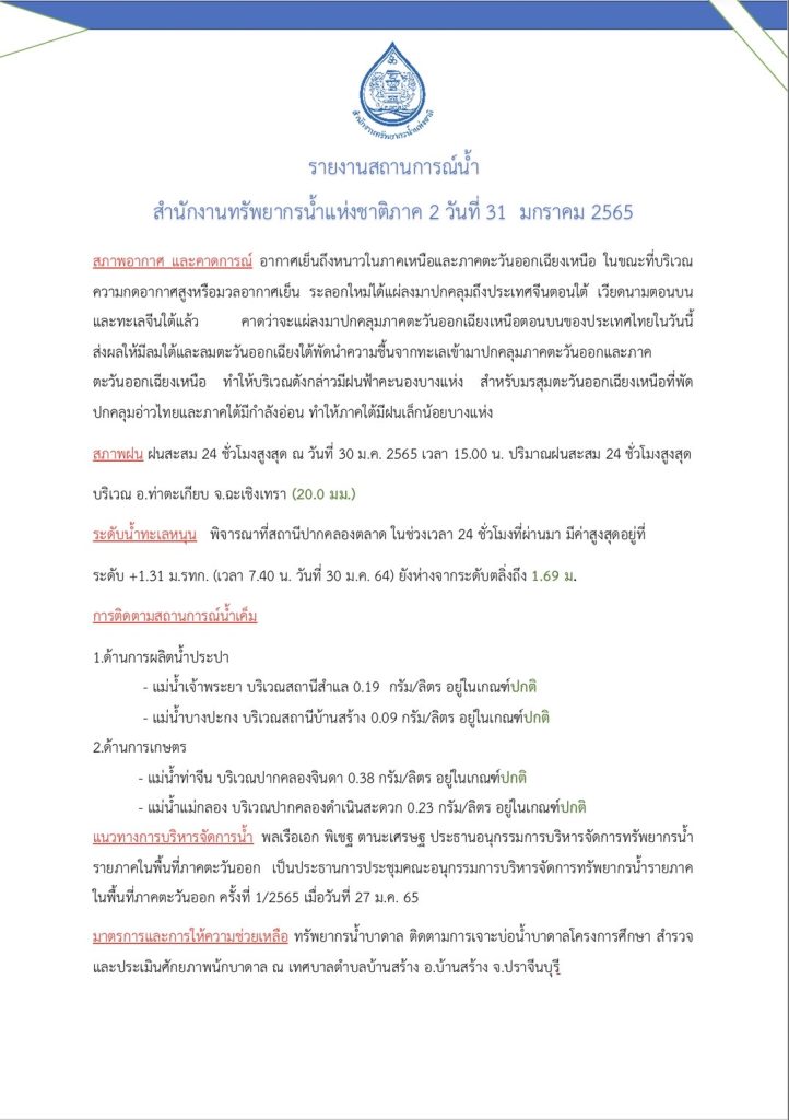 รายงานสถานการณ์น้ำ วันที่ 31 มกราคม 2565