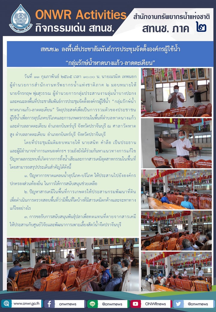 สทนช.2 ลงพื้นที่ประชาสัมพันธ์การประชุมจัดตั้งองค์กรผู้ใช้น้ำ “กลุ่มรักษ์น้ำหาดนางแก้ว-ลาดตะเคียน” ณ ศาลาวัดหาดสูง ตำบลลาดตะเคียน อำเภอกบินทร์บุรี จังหวัดปราจีนบุรี 12 กุมภาพันธ์ 2022 by ชลธิชา เมฆนิล
