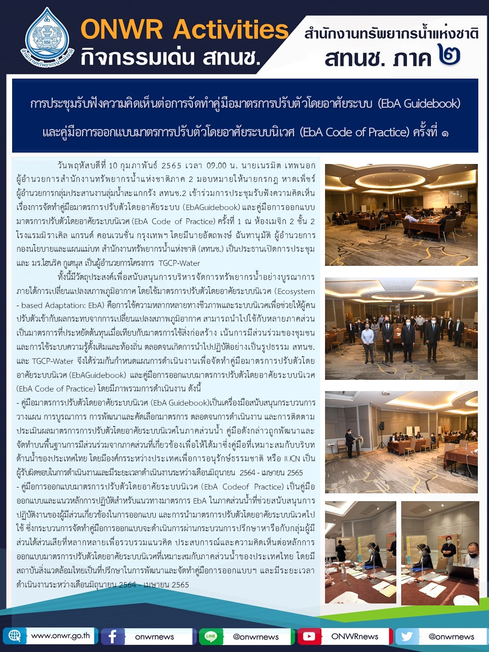 สทนช.2 เข้าร่วมประชุมรับฟังความคิดเห็นต่อการจัดทำคู่มือมาตรการปรับตัวโดยอาศัยระบบ (EbA Guidebook) และ คู่มือการออกแบบมาตรการปรับตัวโดยอาศัยระบบนิเวศ (EbA Code of Practice) ครั้งที่ 1 14 กุมภาพันธ์ 2022 by ชลธิชา เมฆนิล