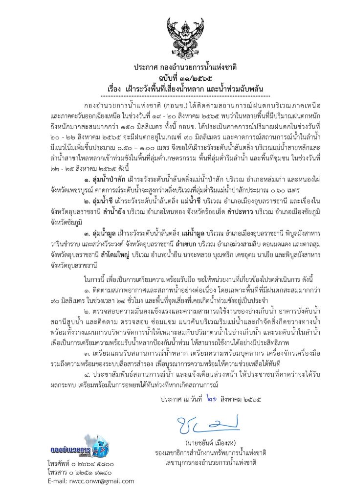 ประกาศ กองอำนวยการน้ำแห่งชาติฉบับที่ 31/2565 เรื่อง เฝ้าระวังพื้นที่เสี่ยงน้ำหลาก และน้ำท่วมฉับพลัน 23 สิงหาคม 2022 by ชลธิชา เมฆนิล