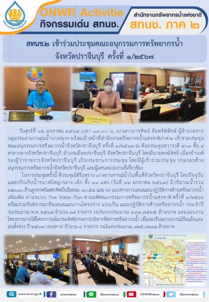 สทนช. 2 เข้าร่วมประชุมคณะอนุกรรมการทรัพยากรน้ำ จ.ปราจีนบุรี ครั้งที่ 1/2567 15 มกราคม 2024 by ปวีณา ประกอบพันธ์