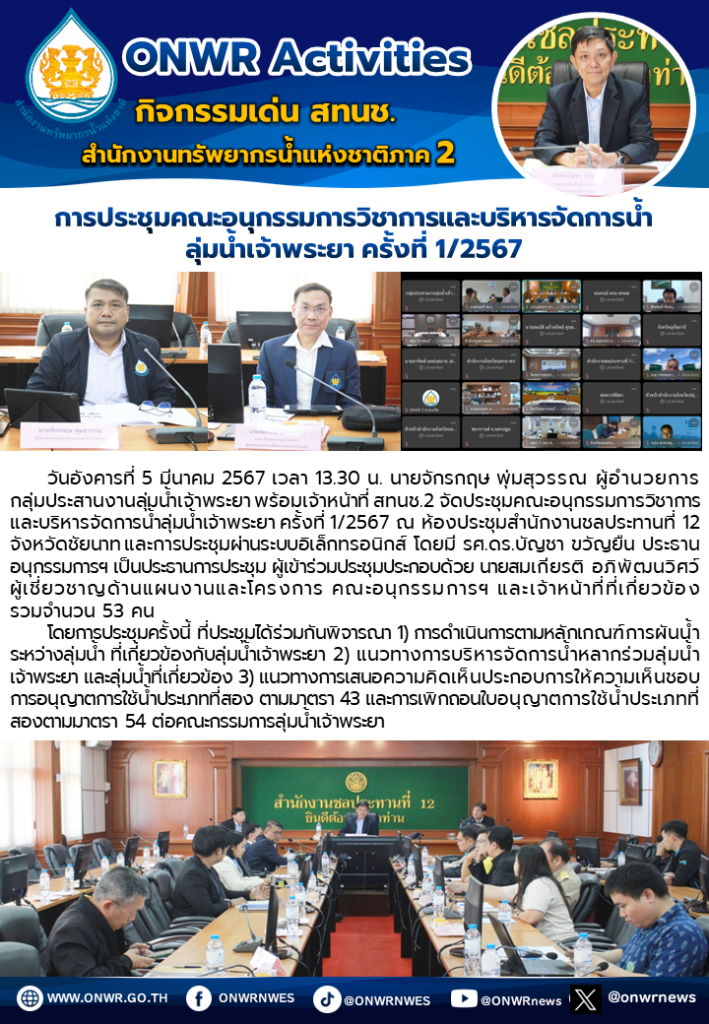 สทนช.2 เข้าร่วมประชุมคณะอนุกรรมการวิชาการและบริหารจัดการน้ำ ลุ่มน้ำเจ้าพระยา ครั้งที่ 1/2567 6 มีนาคม 2024 by ปวีณา ประกอบพันธ์