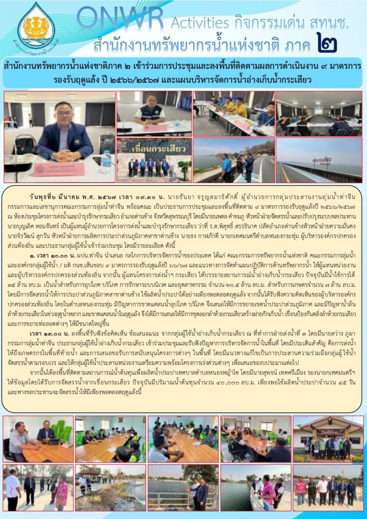 สทนช. 2 เข้าร่วมประชุมและลงพื้นที่ติดตามผลการดำเนินงาน 9 มาตรการรองรับฤดูแล้งฯ และแผนบริหารจัดการน้ำอ่างเก็บน้ำกระเสียว 7 มีนาคม 2024 by ปวีณา ประกอบพันธ์